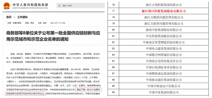 7月12日,浙江明日控股集團(tuán)股份有限公司獲評(píng)首批全國(guó)供應(yīng)鏈創(chuàng)新與應(yīng)用示范企業(yè)。此次商務(wù)部等八部門秉持“公開、公平、公正”原則在前期266家全國(guó)供應(yīng)鏈創(chuàng)新與應(yīng)用試點(diǎn)企業(yè)中評(píng)審精選94家作為首批全國(guó)示范企業(yè),“試點(diǎn)”變“示范”是對(duì)明日控股在保障塑化供應(yīng)鏈穩(wěn)定、賦能現(xiàn)代供應(yīng)鏈發(fā)展特別是疫情期間突出貢獻(xiàn)的充分肯定。