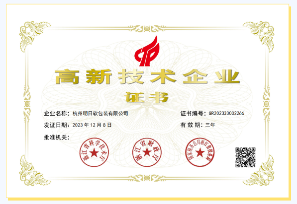 近日,明日軟包裝公司順利通過了“國家高新技術(shù)企業(yè)”權(quán)威認(rèn)證,“2023年度第一批浙江省專精特新中小企業(yè)”評審。