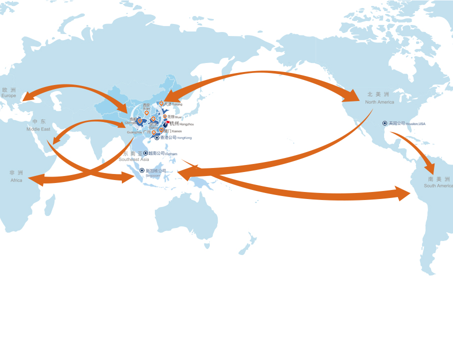 明日積極搭建暢通、便捷的分銷服務網絡體系,提高商品附加值和客戶價值。 明日塑化原料供應鏈服務業務立足終端客戶,下游塑化制品客戶超過15000家,產品直銷率在80%以上,并在杭州、廣州、廈門、武漢、天津、成都、西安、無錫等核心集散地建立起了區域公司,形成了覆蓋全國的塑化分銷服務網絡體系, 公司還在新加坡、香港、越南、美國成立境外公司,開展國際貿易業務。